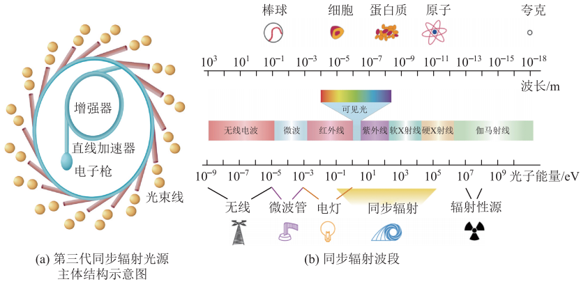 同步辐射是指速度接近光速的带电粒子在做曲线运动时沿切线方向发射出的电磁辐射,它的光谱很宽,可以覆盖从红外、紫外、软X射线到硬X射线的光谱范围,为众多基础科学领域和应用研究提供先进手段。从此人类对世界的探索,在空间上拓展到原子与分子尺度,在时间上拓展到纳秒、皮秒或飞秒尺度。通过同步辐射光源,我们能够看到以前难以观察的物质内部结构以及变化过程。同步辐射光源是基于同步加速器的装置,其主要组成部分包括:注入器、储存环、光束线、实验站。同步辐射光源被称为高品质的巨型X射线机和超级显微镜,具有高亮度、高准直性以及波长可调等不可替代的优点,是支撑众多学科前沿基础研究与高新技术研发不可或缺的实验平台(图2)。