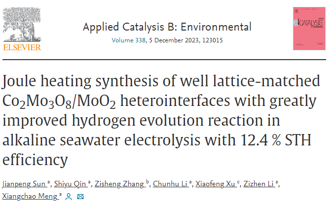 通讯作者:孟祥超; 通讯单位:中国海洋大学; 原文链接:https://doi.org/10.1016/j.apcatb.2023.123015 全文速览 在此,我们通过快速焦耳加热方法,仅用130秒就成功在泡沫镍上制备了晶格匹配良好的Co2Mo3O8/MoO2异质界面。值得注意的是,快速焦耳加热可以有效避免长时间加热引起的催化剂氧化,并获得丰富不配位Mo4+位点,这有助于提高HER的电催化性能。制备的Co2Mo3O8/MoO2具有与Pt基电催化剂相当的HER活性(在10 mA cm?2下为23 mV)。同时样品在200小时的测试中也显示出在碱性海水电解中优异的稳定性。值得注意的是,太阳能驱动的H2O-H2电解槽还显示出12.4%的太阳能-氢气(STH)效率。国产阴离子交换膜(AEM)海水电解槽的池电压在50°C下200 mA·cm?2时仅为2.13 V,生产1 m3 H2仅需4.7 kW-h。DFT计算表明,电子自发分布在Co2Mo3O8/MoO2异质界面的Co–O–Mo键上,可以调节Mo位点的电子结构和d带中心,从而实现H2O在Mo位点的高效吸附和O位点接近零的氢吸附自由能。这项研究提供了一种通过焦耳热调节化学态的新策略,以高效分解海水释放H2。 背景介绍 电催化海水分解作为一种有效的氢气生产方法,被认为是解决淡水短缺危机和满足未来全球能源需求的一种很有前途的替代方案。二氧化钼(MoO2)作为HER电催化剂,以其良好的导电性、耐腐蚀性而日益受到人们的关注。然而,由于暴露不足和活性位点反应动力学差,MoO2的电催化活性需要进一步提高才能得到广泛应用。通常,MoO2的电催化活性由水的吸附和氢从表面Mo位点或O位点的解吸决定。界面工程作为一种有效的方法,可以直接调节界面上的Mo-O键,然后调整结合能,从而加速H2的产生。 近年来,焦耳热效应被应用于快速合成新材料,材料可以在超高温(>2000?K) 短时间内(≈12?ms)快速合成,并避免在长时间加热过程中活性位点的堆积。同时,快速冷却也容易导致结构畸变和晶格应变,从而提供丰富的不配位催化位点。因此,快速焦耳加热有望弥补传统加热过程中催化剂界面上活性位点的氧化、聚集和失活问题,并可能实现丰富的不配位Mo位点。然而,尚未对焦耳加热效应进行相关研究来设计和合成MoO2基电催化剂。此外,泡沫镍(NF)和泡沫铜(CF)的使用可以有效地避免粉末催化剂容易脱落的问题。三维(3D)形态、空穴结构和导电基底可以提高比表面积,加速电子转移,增加活性位点,有利于H2的释放。 研究目标 在这里,我们通过快速焦耳加热构建了一种新型的在泡沫镍上晶格匹配良好的富含非配位Mo4+位点的Co2Mo3O8/MoO2/NF电催化剂。在焦耳加热过程中,Co2Mo3O8/MoO2/NF暴露出丰富的Co2Mo3O8和MoO2相容界面和晶格位错,这可以导致异质界面上的电子重排,增强界面上的Mo-O键,从而优化活性位点的活性。结果表明,Co2Mo3O8/MoO2/NF在海水裂解和阴离子交换膜(AEM)海水电解槽中表现出优异的HER活性和稳定性。最后,通过实验和理论研究,探讨了制备样品的机理。 总结与展望 总之,通过快速焦耳加热和氢还原方法在泡沫镍基底上制备了晶格匹配良好的Co2Mo3O8/MoO2异质界面。高温快速处理促进了晶格匹配的Co2Mo3O8/MoO2/NF的形成,增强了丰富的非配位Mo4+位点,调节了O原子的电子结构。电化学测量表明,Co2Mo3O8/MoO2/NF提供了较低的过电位。