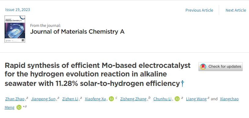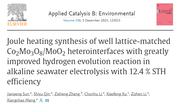 近日,中国海洋大学孟祥超教授科研团队在JMCA和ACB期刊分别发表了题为“Rapid synthesis of efficient Mo-based electrocatalyst for the hydrogen evolution reaction in alkaline seawater with 11.28% solar-to-hydrogen efficiency”和“Joule heating synthesis of well lattice-matched Co2Mo3O8/MoO2 heterointerfaces with greatly improved hydrogen evolution reaction in alkaline seawater electrolysis with 12.4 % STH efficiency”的研究成果。
